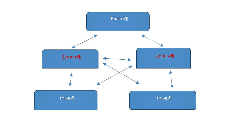Производится товар – который продаётся за деньги – деньги вкладываются на покупку власти (взятки, финансирование выборов, лоббирование) – власть перераспределяет финансовые потоки в пользу тех, кто вложил деньги – деньги вкладываются в производство товара, даются производителю под проценты, получая ещё большее деньги, и далее по кругу. Выстраивается пирамида.